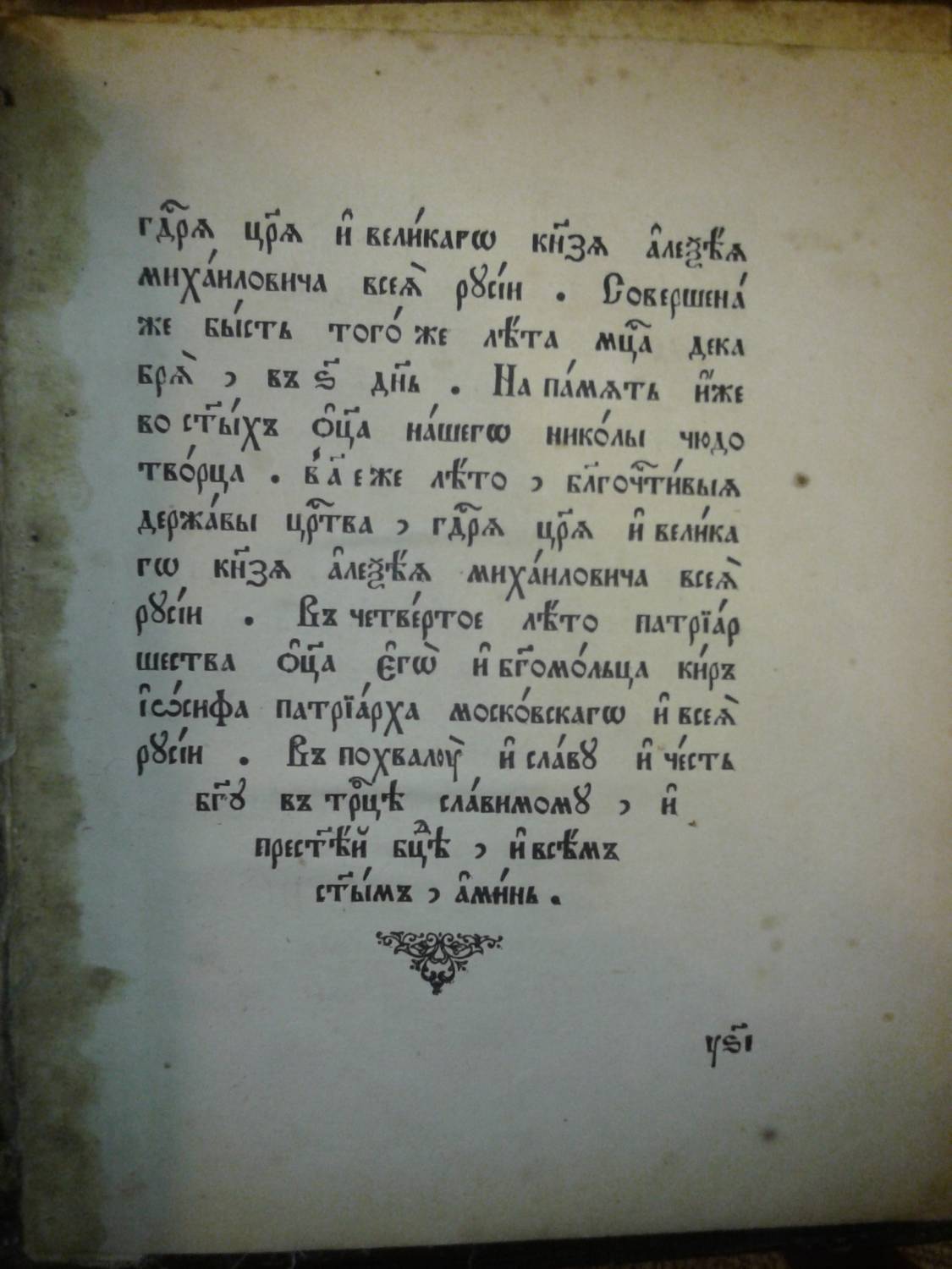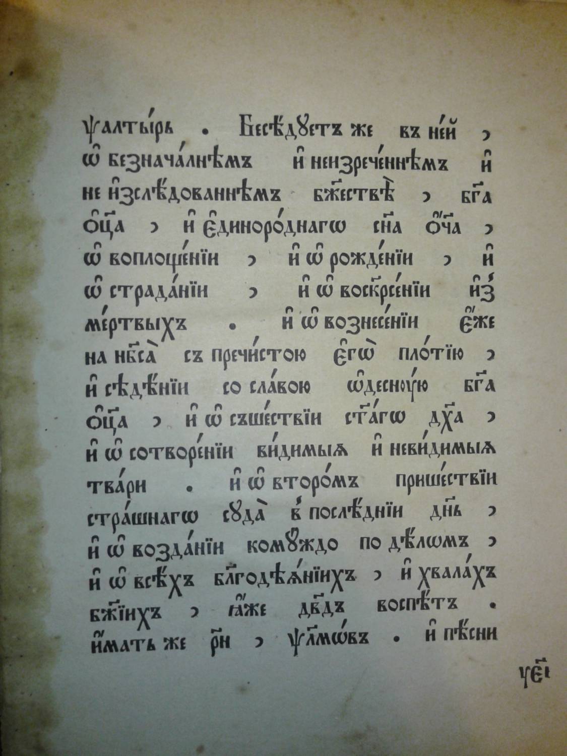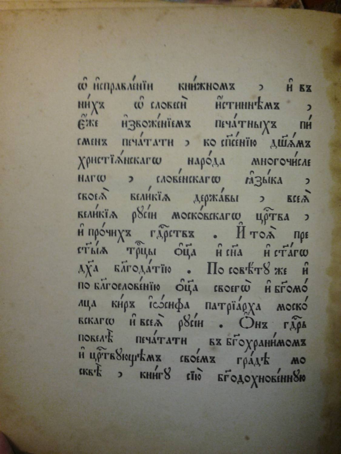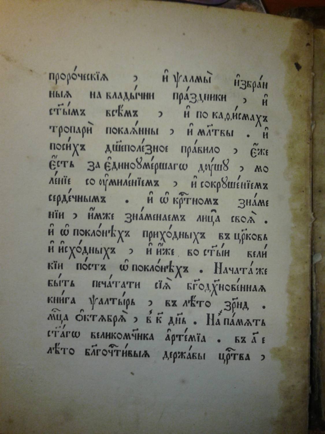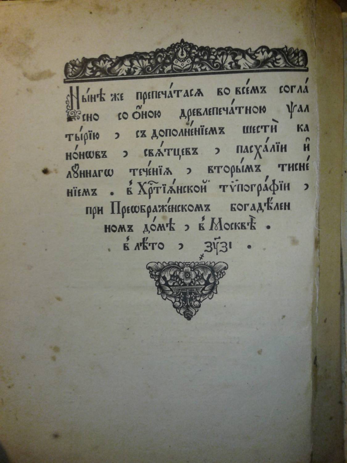 | Книга Истиннаго Древлего Благочестия "Псалтырь", писана до никониянской ереси при патриархе Московском и Всея Руси Иосифе и царе Алексее Михайловиче в (20 октября 7154 году) 1645 году, а перепечатана во всём согласно с древлепечатной псалтырью, с дополнением шести канонов, святцев, пасхалии и лунного течения, вторым тиснением в Христианской типографии при Преображенском богаделенном доме, в Москве, в (7417) 1908 году.
